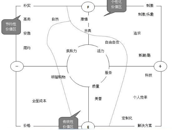 | 科技導向、尋求快速方便獲取大量信息地方法追求最佳表現(xiàn) 采用最新的科技成果、追求全球同一標準人際交往“電子化”、“虛擬化” | 追求身心健康、有活力喜歡運動尋求健康、有活力地生活方式主動、活躍、積極、自由 | 不安于現(xiàn)狀、需要獲得更大的成功 對未來個人發(fā)展有清晰目標不懈努力需要獲得他人的認可和尊敬 | 積極砍價格系統(tǒng)地尋找價廉物美地商品節(jié)省 |